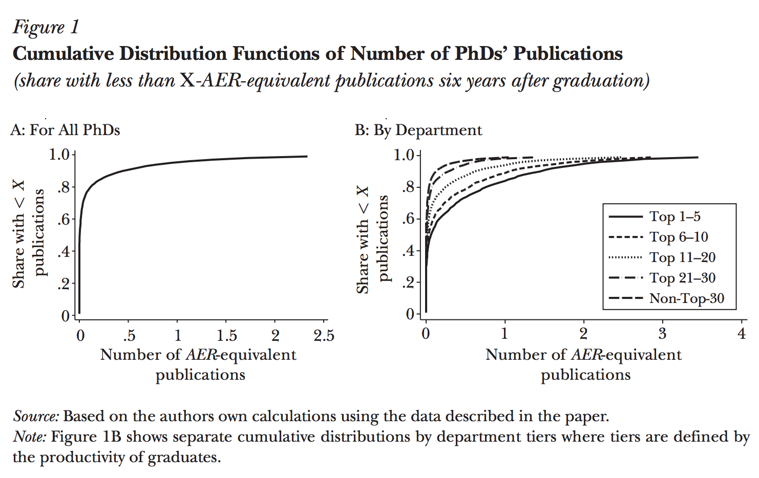 And what are the results? They find that only the very best (in terms of research production) of each department do particularly well, and that the rest tend to be very similar regardless of the department. In other words, a median PhD from Harvard / MIT / Chicago is not very different (in terms of research productivity) that the median from another less successful department. The results are striking because they are very strong, as can be seen in their first Figure: